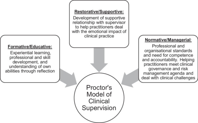 Supervision is conceptualised as a supportive environment in which the supervisee can reflect upon their work, and receive objective feedback and guidance, in pursuit of building competence and capability. Procter (2008) has articulated this in terms of three high-level supervisory functions, that he calls ‘formative’, ‘normative’ and ‘restorative’ activities, which together combine to enable supervisee development, proficiency and functioning